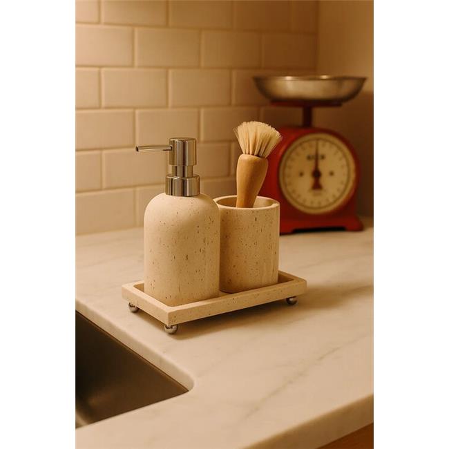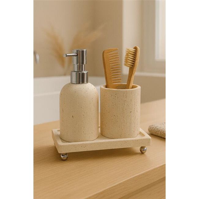 Akayev Mermer Traverten 3 Parça Gümüş Ayak Banyo Seti Mutfak Sıvı Sabunluk Seti